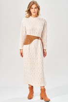 На полочке изделия расположены горизонтальные нагрудные вытачки, притачная вертикальная планка для застежки петли/пуговицы. Горловина обработана воротником рубашечного типа на стойке. Рукав втачной, одношовный, с притачной рюшей 13 см. К основе платья притачена рюша со сборкой. Длина изделия платья по спинке 130 см, длина по спинке до притачной рюши 78 см. В боковых швах платья расположены карманы. Платье дополнено съемным текстильным поясом.(фурнитура может отличаться от представленной на рекламном фотоматериале)