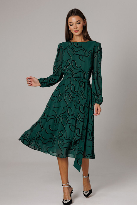 Элегантное платье, отрезное по линии талии из воздушного шифона на подкладке. В верхней части изделия расположены нагрудные горизонтальные вытачки, по спинке и полочке: вертикальные талиевые. Линия горловины оформлена в форме «лодочка». Нижняя часть платья по крою: «полусолнце». В среднем шве спинке потайная застежка-молния. Рукав втачной, одношовный. По окату и низу рукава-сборка. Длина платья по спинке 111 см. Длина рукава 62 см.