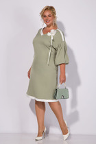 Спинка с цельнокроеным рукавом «летучая мышь» имеет средний шов, в котором расположен у горловины разрез с пуговицей-застежкой. Рукав длины 7/8 с плечевым швом, который оканчивается разрезом 2,5 см. Юбка платья А-силуэта, состоящая из цельной детали спереди, сзади: средний шов. Между лифом и юбкой платья вставлен пояс 3,5 см с эластичной тесьмой внутри, который подчеркивает линию талии. Длина платья по среднему шву спинки 113-115см (в зависимости от размерного ряда).