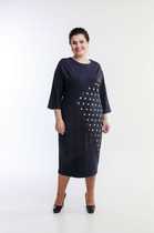 Платье лёгкое, струящееся на запахе. Отрезное по линии талии, расширенное к низу. Воротник выходящий из линии плеча, пиджачного типа, на участке воротника - декоративная перемычка создающая мягкую складку. Рукава одношевные с узкой резинкой по низу и сборкой по окату. Длина рукава до линии локтя. Застежка внешней части переда на потайную кнопку, внутренней части переда на завязку. В боковых швах карманы. Особенностью платья платья является обработка всех внутренних швов платья окантовкой, что придает изделию элитный вид.