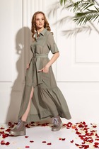 Платье женское легкое, шифоновое, удлиненное, без подкладки, свободного кроя. По переду и спинке отрезное по линии талии, по низу два волана со сборкой. Застежка до линии талии на обтяжные пуговицы и петли , под застежкой пришит тонкий поясок из основной ткани имитирующий затяжку кулисы. Рукав втачной, одношовный. По низу рукава и подрезу линии талии узкая резинка. Вырез горловины круглый, по горловине переда небольшая сборка. По правой стороне волана переда - разрез, который придает этому легкому платью еще больше женственности и кокетливости.
