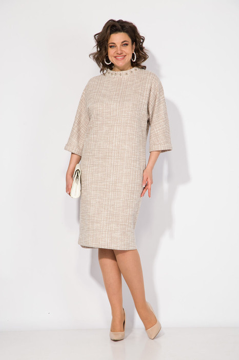 Шикарное платье в стиле «Шанель», лаконичное с ярким акцентом в виде бусин жемчуга по горловине! Модель O-образного силуэта, с цельнокроеным рукавом на притачной манжете с заворотом.  В платье присутствуют карманы в боковом шве. Низ фигурной формы с подгибкой. Застежка по горловине спинки на потайную молнию. Этот образ сдержанной красоты и сделает Вас поистине роскошной!