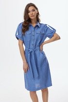 Стильное и эффектное платье, в стиле- сафари! Модель выполнена из хлопкового джинса! Платье полуприталенного силуэта, длиной за колено. По талии отрезное. Воротник - небольшая стойка, переходящая в застежку на металлическую молнию. Рука рубашечный, полной длины. По низу рукава предусмотрен манжет с застежкой на пуговку. По полочке расположены накладные карманы с клапаном. В платье также предусмотрены накладные карманы. По спинке кокетка с центральным швом переходящий в разрез на свободу движения.