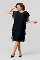 Платье свободного силуэта со спущенной линией плеча. Воротник рубашечного типа на стойке. Центральная застёжка на петли и пуговицы. По передним половинкам платья накладные карманы с цельнокроеным клапаном. Низ платья фигурный. Спинка платья чуть длиннее переда, по низу обработана обтачкой. Низ присборивается на шнур из основной ткани, таким образом формируя желаемый силуэт платья. Рукав двухшовный. Низ рукава на притачной манжете с патой. По верхнему центральному шву рукава пришиты две пуговицы, что позволяет регулировать длину рукава.
