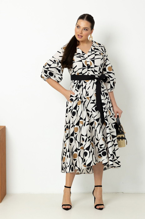Платье с V-образным вырезом горловины, отрезное по талии и фигурным низом.  На уровне талии съёмный пояс из контрастной ткани. Перед с планкой с пуговицами до талии. Спинка с талиевыми вытачками и потайной молнией в среднем шве. Рукава втачные с деталью со сборкой по шву притачивания и резинкой по низу. Платье с карманами в боковых швах.