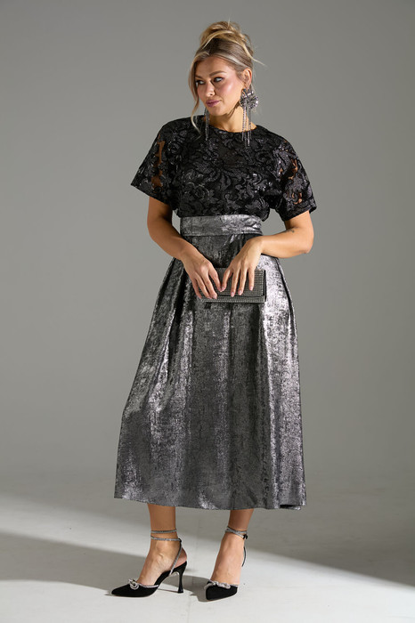 Платье длины "миди" с объёмной юбкой. Верх платья выполнен из ткани расшитой пайетками.  Застежка на потайную молнию по среднему шву спинки. В комплекте идет длинный съемный пояс. На юбке по линии талии заложены складки.