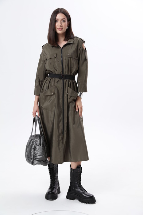 Платье в стиле "сафари" длиной макси со свободной юбкой и укороченными рукавами. Застёжка центральная на молнию, съемный пояс на резинке. По переду платья расположено четыре накладных функциональных кармана. По плечам декоративные паты. Размер на модели -44, рост модели 175 см.