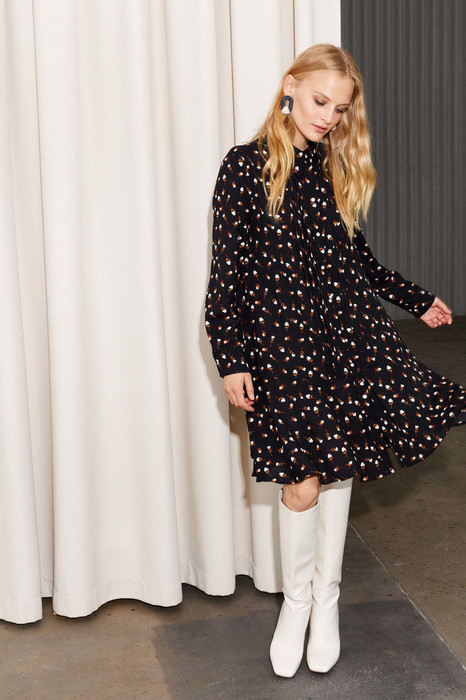 Платье А-силуэта из атласной ткани. По горловине воротник рубашечного кроя. Застежка на петли и пуговицы, широкие защипы. Рукав втачной, по низу манжета с застежкой на петлю-пуговицу. По спинке кокетка, по низу платья притачной волан.