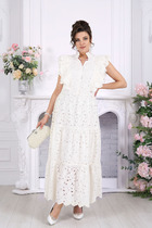 Платье в стиле "Бохо", свободного кроя А- силуэта из легкой, струящейся вискозы. Округлый вырез горловины, вытачки из проймы, в боковых швах карманы. Рукав длинный, съёмный, к изделию привязывается тесемками, которые вставлены в пройму и в рукав. По спинке средний шов, переходящий в застёжку на навесную петлю/пуговицу, и накладные отлетные детали, не доходящие до центра. В комплектацию входит съёмный пояс из экокожи. Платье можно носить как с поясом, так и без него.