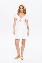 Платье свободного кроя выполнено из нежной струящейся вискозы, дизайн горох. Линия плеча спущена, рукав длинный, по низу рукава два волана. Округлый вырез горловины. По спинке средний шов, переходящий в застёжку на навесную петлю и пуговицу, по низу платья воланы.