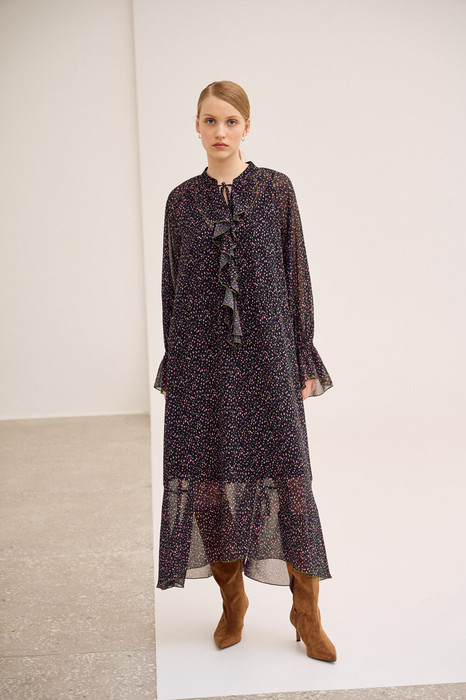 1681ТПлатье свободного кроя, выполнено из шифона, дизайн мелкий цветочек. Рукав длинный реглан, по низу рукава резинка. Глубокий V-образный вырез горловины, в который вставлена рюша, по горловине стойка на завязку, по середине выреза застежка на навесной потайной крючок. По линии талии по переду и спинке кулиса на завязку, по низу платья притачной волан. В комплект входит платье-комбинация из трикотажной подкладки на бретелях.