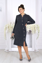 Платье полуприлегающего силуэта, выполнено из костюмной ткани. Рукав втачной длинный, выполнен из хлопка. По верхней и нижней части рукава сборка, по низу рукава манжета на застежку на петли и пуговицы. По горловине воротник рубашечного кроя. По левой стороне складка имитирующая запах. Выше линии груди пришиты металлические пуговицы. По спинке средний шов переходящий в застежку на потайную молнию.
