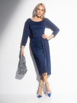 Эффектное трикотажное платье с принтованным бантом — великолепный выбор для торжественных случаев! Его необычный дизайн привлекает внимание: спереди — округлый вырез, а сзади — углубленный V-образный. От плеча до талии спереди и по спинке платья проходит изящный волан, который придаёт ему особое очарование. Сзади разрез.