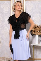 Нарядное платье в черно-голубом цвете — отличный выбор для особых событий. Модель с отрезной талией и резинкой, которая обеспечивает комфорт и подчеркивает фигуру. V-образный вырез украшен нежным воланом, добавляя романтичности. Рукава-крылышки придают образу легкость. Юбка А-силуэта с клиньями имеет спереди рельефные разрезы. В комплекте пояс-шнурок из основной ткани, который подчеркивает талию и завершает образ.
