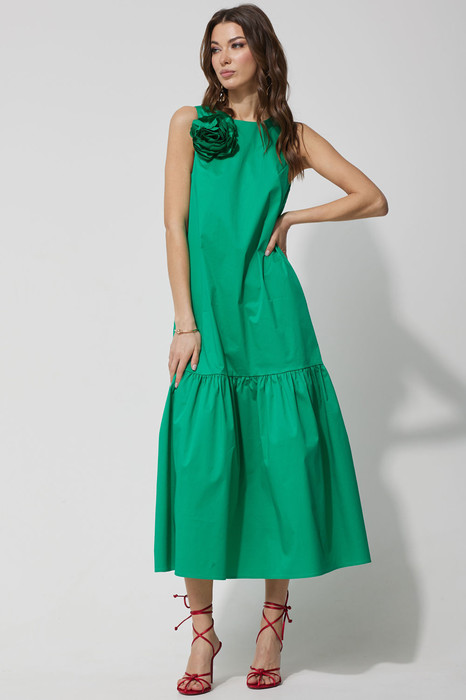 Платье А – силуэта из хлопковой ткани. Горловина округлая, по спинке застежка на молнию. По низу платья  волан со сборкой от подреза. По переду нагрудные вытачки. В комплект сходит съемный декор.