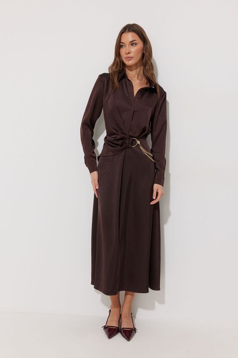 Платье полуприлегающего силуэта расширенное книзу из струящейся ткани. Воротник рубашечного  типа с супатной(потайной) застежкой по центру. Рукав втачной длинный, по низу манжета с застежкой на петли и пуговицы. Платье отрезное по линии талии, в подрез  вставлена резинка. По переду декоративная отлетная деталь на запах.  Платье декорировано съемной фурнитурой. По переду и спинке шлевки для декора. Обращаем ваше внимание, что фурнитура может отличаться от фото.