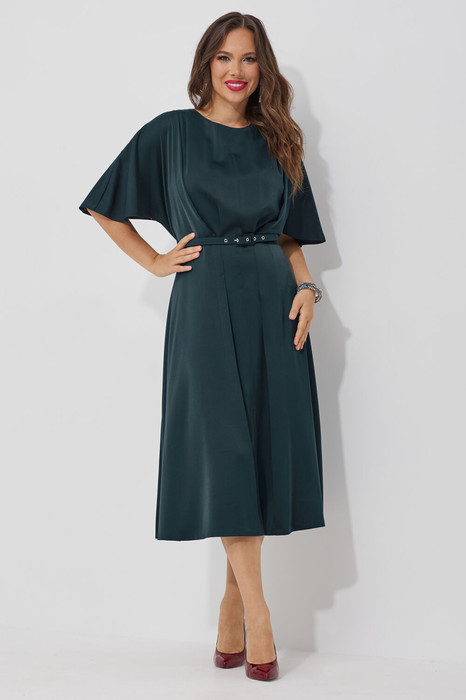 Элегантное платье А-образного силуэта. Выполнено из шелковистой ткани средней плотности с атласным блеском. Платье отрезное по талии. Верх платья свободный с цельнокроеным рукавом-крылышком. По плечам аккуратная драпировка. По спинке застежка на потайную молнию. Платье на подкладке. Длина платья от плечевого шва 126см Длина рукава 33см.