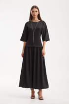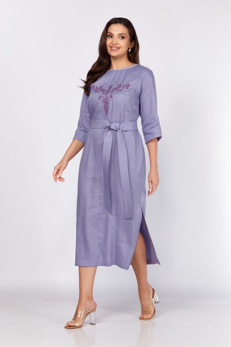 Платье прямого силуэта,с карманами и разрезами в боковых швах. По спинке средний шов. По переду нагрудные вытачкии и декоративная вышивка в области груди. Горловина округлой формы, обработана кружевом. Плечо спущено. Рукав 3/4 с цельнокроенной манжетой. Пояс из основной ткани.