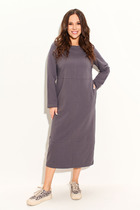 Актуальное удлиненное платье выполнено из хлопкового футера трехнитка с ненавязчивым блеском. Изделие полуприлегающего силуэта хорошо садится по фигуре, скрывая любые недостатки и подчеркивая Ваши достоинства. Центральный шов по переду переходит в разрез до колена, удлиняя силуэт. Рукав приспущенный, длина 7/8. Украшением служат объемный воротник, который прекрасно прячется под верхней одеждой, также имеются накладные карманы, один из которых декорирован тесьмой и блочкой со стразами. Идеально сочетается с различной по стилю обувью и бижутерией. Длина по спинке 122 +-1см.; длина рукава 59 +-1см. Изделие подойдет на рост 170 см.
