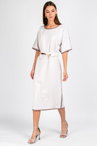Модель с отрезной линией по талии и съемным поясом красиво подчеркивает женственность и стройность. Рукава 3/4 с аккуратными манжетами по низу добавляют образу изящества и внутренней гармонии. Прямой, немного зауженный к низу силуэт с небольшим разрезом — создаёт баланс между элегантностью и практичностью.