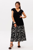 Летнее, отрезное по линии талии платье с расширенной к низу юбкой. Лиф платья выполнен из эластичной хлопковой ткани, юбка платья из плательной ткани на подкладке из хлопка. Платье с коротким втачным рукавом и отложной манжетой. По лифу переда платья рельефы, по спинке талиевые вытачки и средний шов. Лиф платья украшен брошью ручной работы. По талии платья пояс из отделочной ткани.