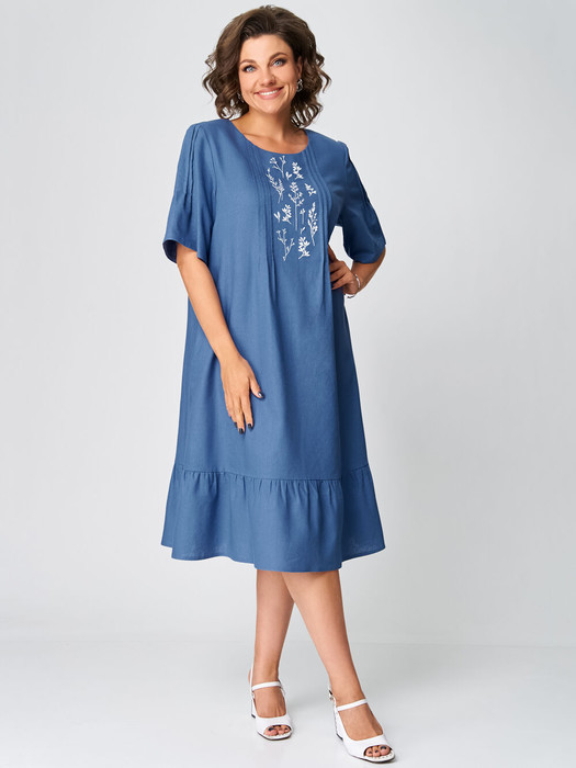 Платье А-силуэта выполнено из льняной ткани. Горловина округлой формы, обработана обтачкой. По переду нагрудные вытачки застрочены защипы. Платье украшает авторская печать по переду. Рукав одношовный , кроткий с защипами. По бокам расположены карманы. Спинка со средним швом. По низу платья отрезной волан с легкой сборкой. Платье без подкладки