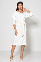 Платье свободного покроя с асимметричными горизонтальными подрезами и кокеткой. Кокетка декорирована печатью и нашивным элементом. Спинка с кокеткой. Рукав втачной одношовный короткий. Длина платья 115 см, длина рукава 22 см. Декоративная нашивка может отлечаться от фото.