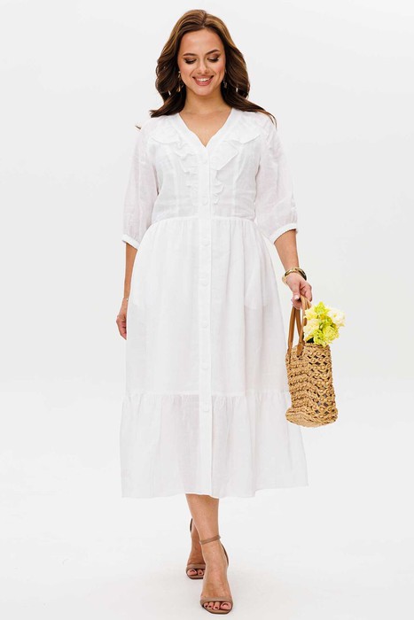Платье женское полуприлегающего силуэта, отрезное по талии, отрезная присборенная рюша по низу изделия. Вдоль горловины притачная планка. Застежка по переду на петли-пуговицы. В области груди, частично по переду вдоль планки, обработаны рюшки. Рукав-реглан, по низу на резинке. Платье на подкладке, карманы в боковых швах.