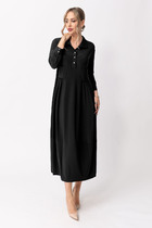 Платье женское А-силуэта, круглая горловина окантована и плавно переходит в заявязку на спине. Спинка со средним швом, у горловины разрез. Рукав втачной , одношовный. Низ рукава на резинке и регулируется завязками. Платье на подкладке.