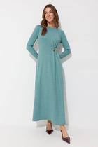 Платье комбинированное длиной макси, отрезное по линии талии с цельнокроеными рукавами. Застежка центральная с цельнокроеными планками на  петли и пуговицы. Верхние части переда и спинки с вертикальными рельефами, начинающимися от линии плеча. Бантовая складка расположена по центру, боковые складки направлены от центра изделия в сторону бокового шва. Рукав цельнокроеный с боковыми частями переда и спинки с углубленной до линии талии проймой. По центру оката рукава сборка. Нижний срез рукава обработан притачной манжетой. Застежка манжеты на  петли и пуговицы. Платье по линии талии собрано на резинку. Горловина изделия круглой формы, обработана воротником-стойкой, с застежкой на  петли и пуговицы. Платье дополнено съёмным бантом. Бант съёмный, продевается в шлевки, расположенные на воротнике-стойке. В комплект к изделию идёт ремень из экокожи.