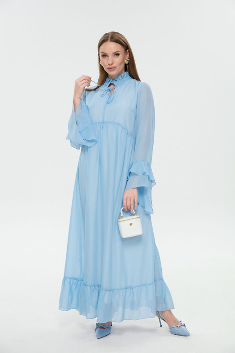 Платье макси свободного кроя с завышенной фигурной линией талии. Горловина оформлена воротником-стойкой с завязками, верхний край украшен рюшей. Рукав втачной широкий с асимметричными воланами по низу. Изделие на подкладке. Низ юбки оформлен воланом.