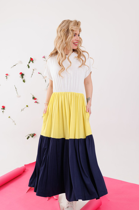 Уютное трехцветное платье в пол из хлопковой ткани полусвободного силуэта с коротким цельнокроенным рукавом. На талии собрано на резинку. Изделие без подклада.