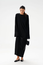 Эффектное двубортное платье длиной миди из облегчённого денима полуприлегающего силуэта. Линия плеча приспущена, рукав втачной три четверти с манжетой и патой. Горловина обработана обтачкой с V-образным вырезом. Линия талии акцентирована притачным поясом. Имеются карманы в боковых швах. Изделие застёгивается на кнопки. Без подкладки.