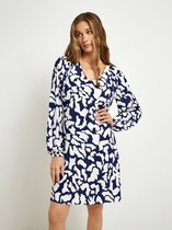 Эффектное двубортное платье длиной миди из денима полуприлегающего силуэта. Линия плеча приспущена, рукав втачной три четверти с манжетой и патой. Горловина обработана обтачкой с V-образным вырезом. Линия талии акцентирована притачным поясом. Имеются карманы в боковых швах. Изделие застёгивается на кнопки. Без подкладки.