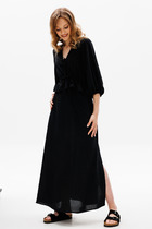 Лёгкое комбинированное платье, состоящее из лифа и юбки. Лиф прямого кроя с втачным рукавом с манжетой и патой на кнопки. Горловина обработана рубашечным воротником с отрезной стойкой. Застёжка центральная на кнопки. Юбка А-силуэта на подкладке.