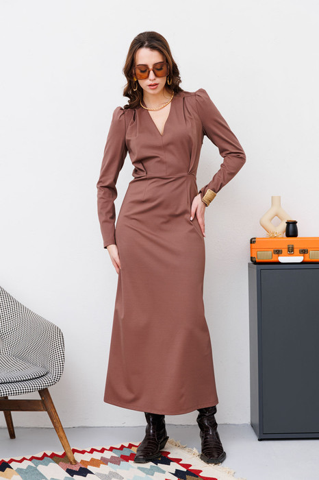 Элегантное платье приталенного силуэта, слегка  расширенное к низу. Отрезное по линии талии. На деталях переда и спинки отрезные кокетки. На детали переда средний шов. По верхнему краю и на участке талиевого шва деталей переда и спинки выполнена сборка. Вырез горловины V-образной формы. На детали нижней части переда и спинки талиевые вытачки. Рукав длинный, втачной. Застежка платья на потайную молнию в боковом шве.