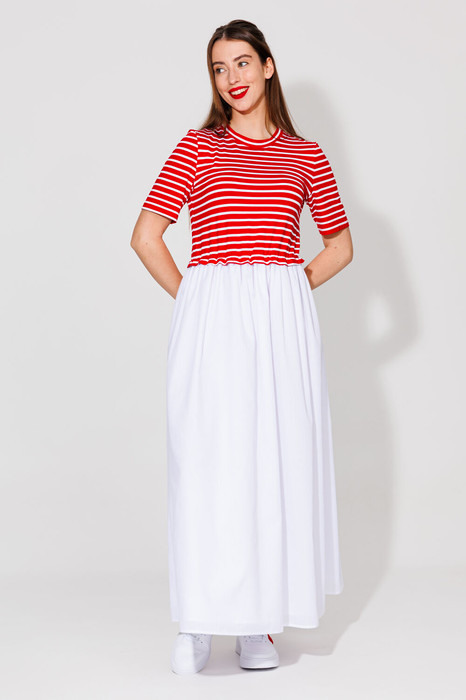 Платье макси комбинированное свободного силуэта с подрезом выше уровня талии. Спинка лифа цельная. Рукав втачной короткий. Нижняя часть платья со сборкой по верхнему шву. Горловина обработана обтачкой.