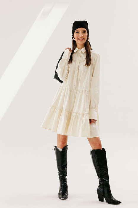 Воздумное платье трапециевидного силуэта отрезное ниже линии талии. Застежка центральная с отрезными планками на петли и пуговицы. Перед и спинка с притачными кокетками. Верхние срезы переда и спинки по линии соединены с кокеткой и собраны на сборку. Рукав втачной, одношовный. Нижний срез рукава со сборкой и разрезом, обработан притачной манжетой. Разрез рукава обработан обтачкой.