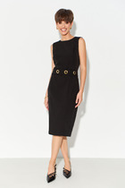Платье длиной миди полуприлегающего силуэта отрезное по линии талии. Верхняя часть переда со средним швом и вытачкой , нагрудная вытачка объединена с талиевой вытачкой. Нижняя часть переда со средним швом и талиевыми вытачками. Вытачки верхней и нижней частей переда расположены на одной оси. Верхняя часть спинки со средним швом и талиевой вытачкой. Нижняя часть спинки со средним швом, талиевой вытачкой. Рукав втачной двухшовный. В шве по переднему перекату располагается разрез. Вырез горловины круглой формы, обработан обтачками. Застежка в среднем шве спинки на потайную тесьму-молнию. Платье декорировано тесьмой из пайеток.