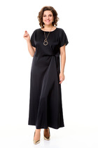Платье прямого силуэта, состоящее из комбинации двух тканей - основной и отделочной. Воротник цельнокроеный хомут. Рукав одношовный, втачной, длинный. Нижняя юбка из отделочной ткани, со сборкой по линии талии. В виде отделки по левой части переда декоративный цветок из отделочной ткани.