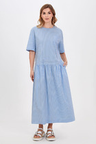 Платье макси с центральной отрезной застёжкой на потайную планку на петли и пуговицы.По переду и спинке цельнокроеные складки на уровне талии. Рукав втачной,одношовный рубашечноно типа. По низу рукава пробиты петли и вставлена завязка для фиксации сборки . Воротник рубашечный стояче отложной. В комплект к изделию идёт пояс из основной ткани для максимально комфортного регулирования объёма.