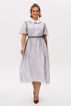Платье макси с центральной отрезной застёжкой на потайную планку на петли и пуговицы.По переду и спинке цельнокроеные складки на уровне талии. Рукав втачной,одношовный рубашечноно типа. По низу рукава пробиты петли и вставлена завязка для фиксации сборки . Воротник рубашечный стояче отложной. В комплект к изделию идёт пояс из основной ткани для максимально комфортного регулирования объёма.
