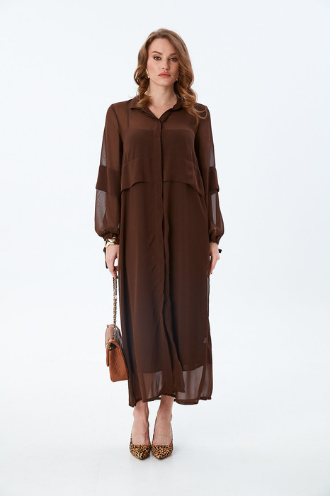 Платье-кардиган макси с центральной отрезной застёжкой на потайную планку на петли и пуговицы.По переду и спинке цельнокроеные складки на уровне талии. Рукав втачной,одношовный рубашечноно типа. По низу рукава пробиты петли и вставлена завязка для фиксации сборки . Воротник рубашечный стояче отложной.