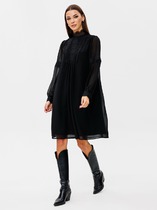 Комбинированное платье, состоящее из лифа и юбки. Лиф прямого кроя с коротким цельнокроеным рукавом с манжетой. Горловина обработана рубашечным воротником с отрезной стойкой. Застёжка центральная на петли и пуговицы.По полочке имитация нагрудных карманов с клапанами. Линия талии собрана на резинку. Юбка А-силуэта на подкладке.