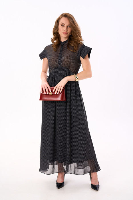 Платье макси с центральной застёжкой на петли и пуговицы, со спущенной линией плеча. В верхней части фигурной полочки сборки. Плечевой шов смещен в сторону переда. По спинке линия талии собрана на кулисы для придания нужной силуэтной формы. Воротник-стойка застёгивается на петлю и пуговицу. Рукав короткий. Юбка расклешена к низу, на подкладке.