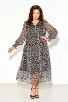 Платье женское полуприлегающего силуэта, зауженное к низу, из костюмно-плательной ткани в сочетании с гипюром. Длина по среднему шву спинки р 50-52 - 101,5 см, р 56-66 – 103,5 см. Перед и спинка двухслойные от плечевого шва до нижней линии бедер, с настрочными декоративными веточками, направленными к низу изделия. Верхний слой выполнен из гипюра. Перед с нагрудными вытачками, идущими из пройм. Спинка, с талиевыми вытачками в нижнем слое, со средним швом, в нижней части которого расположена шлица. В левом боковом шве обработана застёжка на потайную тесьму - "молнию". Горловина переда и спинки округлая, по переду углубленная. Рукава втачные, одношовные, выполнены из гипюра. Низ рукавов оформлен фестонами. Длина рукава 44 см. Платье с плечевыми накладками.