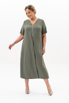 Платье женское, расширенное к низу, выполнено из трикотажного полотна с фактурной лицевой стороной «люрекс». Модель на трикотажной подкладке, с плечевыми накладками. Перед платья асимметричный, состоит из двух деталей, скрепленных на запах. На левой детали переда обработан рельефный шов с разрезом по низу. Правая деталь переда задрапирована сборкой и входит в рельеф на участке между двумя горизонтальными подрезами боковой части переда. На спинке обработаны талиевые вытачки и средний шов с застежкой на потайную тесьму-«молнию» (50 см). Рукав трехчетвертной. Длина платья – 137 см. Длина рукава – 47 см.