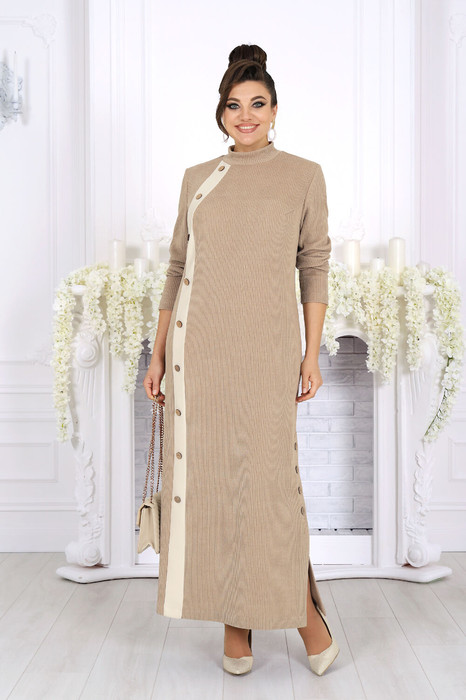 Платье женское полуприлегающего силуэта, выполнено из фактурного трикотажного полотна с рубчиком. Модель без подкладки, без застежки и плечевых накладок. В левом боковом шве обработана шлица с застежкой на 5 петель и 5 декоративных пуговиц. Перед платья асимметричный: с нагрудной вытачкой на левой части переда и планкой с декоративными пуговицами на правой; планка выполнена из гладкого отделочного трикотажного полотна. Спинка с талиевыми вытачками. Круглая горловина оформлена невысокой стойкой. Рукав втачной, длинный.