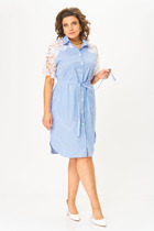 Платье женское, полуприлегающего силуэта, комбинированное, выполнено из двух видов трикотажных полотен – гладкого однотонного и жаккардового с напылением. Модель на трикотажной подкладке, с плечевыми накладками. Перед платья асимметричный: с нагрудной вытачкой на правой части переда и фигурным подрезом с контрастной бейкой на левой. На спинке обработаны талиевые вытачки и застежка на потайную тесьму-«молнию» (50 см) в верхней части среднего шва и разрезом в нижней. Горловина круглой формы, углубленная спереди. Рукав втачной, трехчетвертной. Длина платья – 102 см; длина рукава – 48 см.