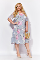 Платье женское, полуприлегающего силуэта, выполнено из гипюра и плательной ткани «сатин». Перед и спинка состоят из двух разных по длине слоев: нижний короче верхнего на 5 см. Модель без подкладки, с плечевыми накладками. Низ платья и рукавов оформлен фестонами. Перед в верхнем и нижнем слоях с нагрудными вытачками, выходящими из пройм. Спинка с талиевыми вытачками и средним швом, в верхней части которого обработана застежка на потайную тесьму-«молнию» (50см), в нижней – разрез. Вырез горловины переда и спинки округлый, углубленный по переду. Рукав короткий, втачной. Верхний и нижний слои платья скреплены по среднему шву, плечевым и проймам. Длина платья (верхний слой)-108 см, длина рукава-26 см.